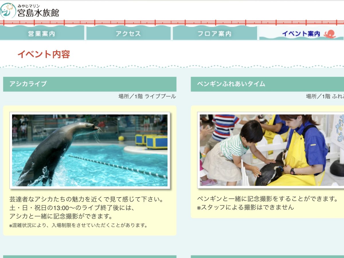 アシカライブショーやペンギンふれあいイベント、餌やりタイムの見学など、毎日開催されています。