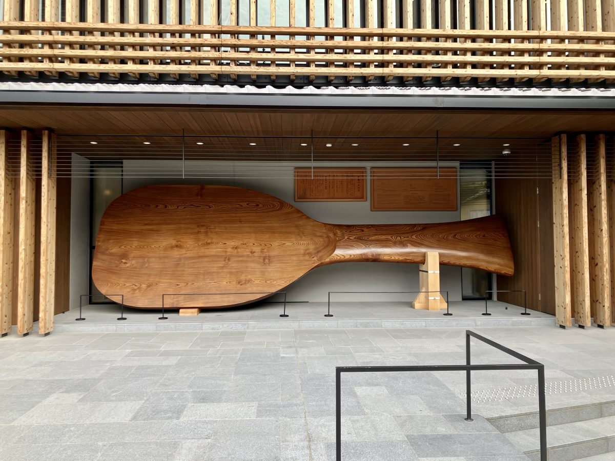 建物正面に横たわるのは、長さ7.7m、最大幅2.7m、重さ2.5tの世界最大の大杓子。