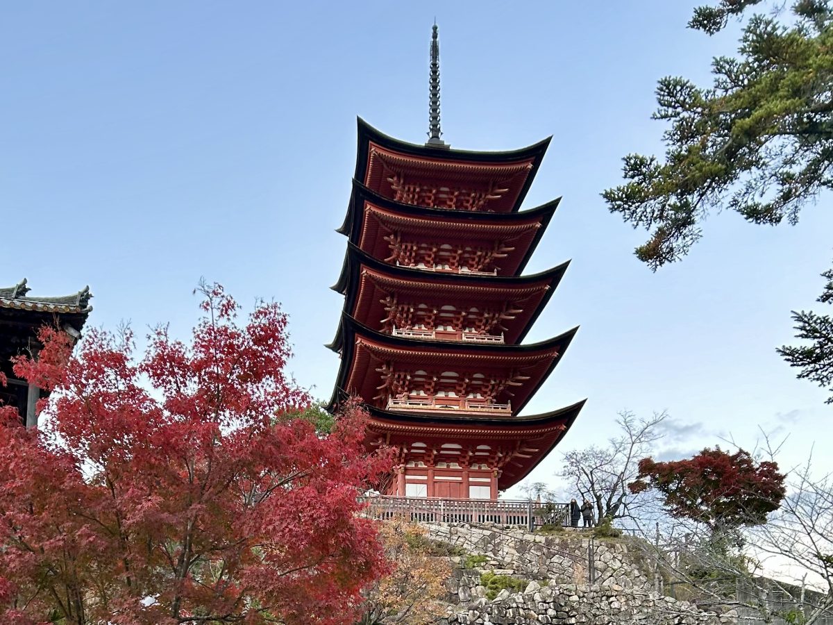 (宮島の桜の名所でもある多宝塔(2025年9月初旬、ニ年間に渡った大修理が終わりました)